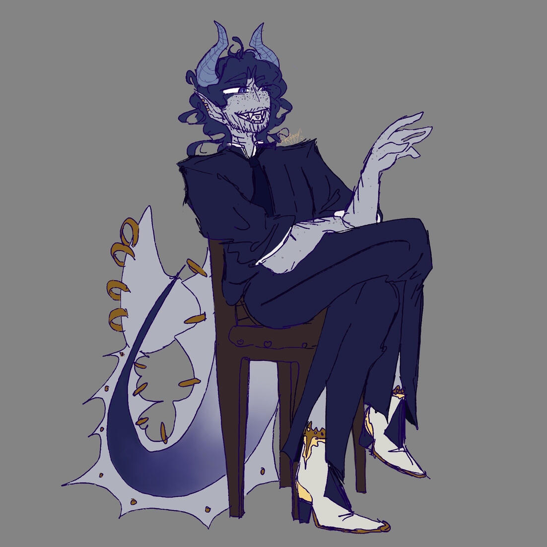 Lake is a 6'1 water ghoul with a grey-blue completion. His fur is thin and short, helping him easily to glide through the water. His horns are a light blue that gets darker as they reach the points, his tail mirrors this, starting at a light blue-grey and getting almost navy at the very tip.